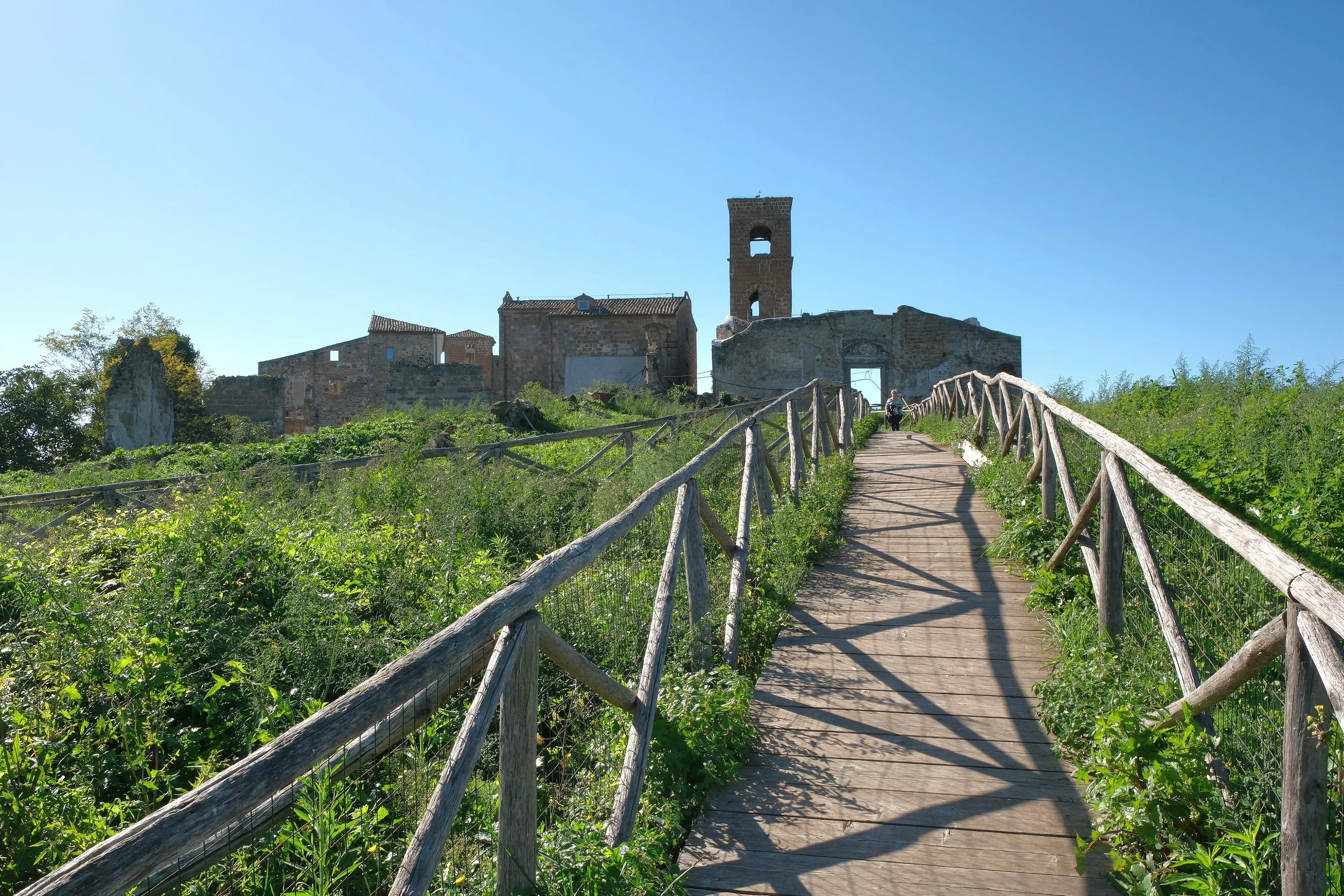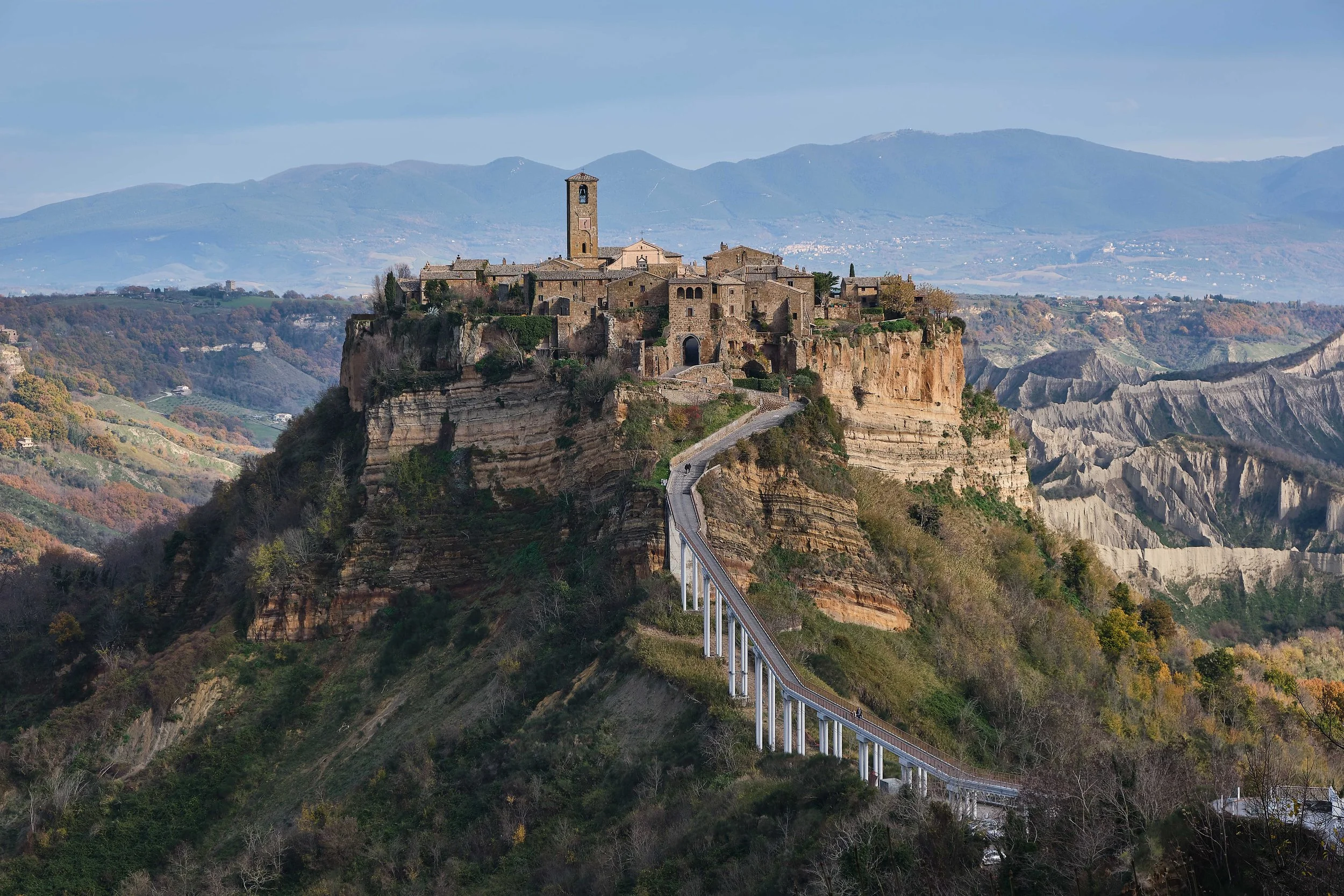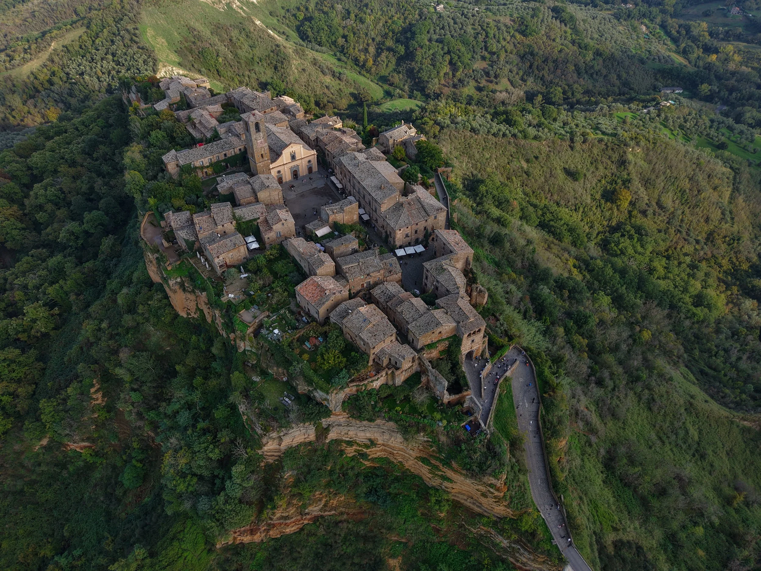 Scenograficamente posizionata su un fragile sperone tufaceo, Civita di Bagnoregio è così definita per via del progressivo crollo delle pareti perimetrali (è stata stimata un’erosione media di circa 7 cm all’anno), con conseguente abbandono da una parte della popolazione nel corso degli ultimi secoli.
