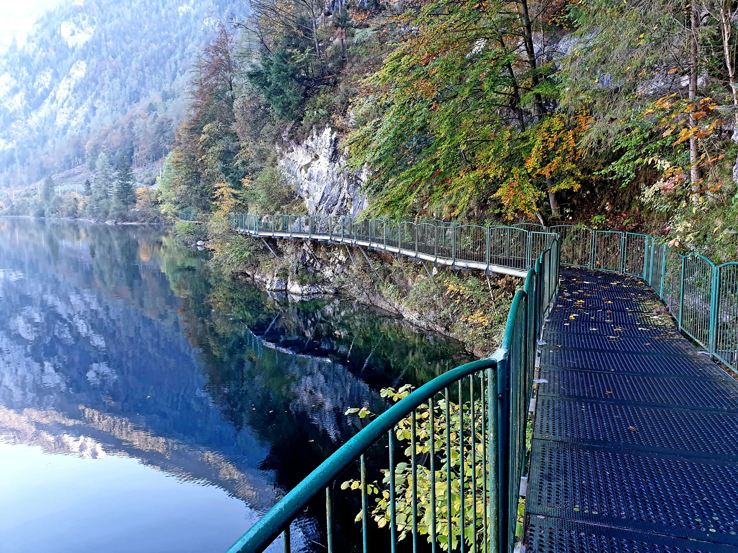 Rosso, arancio, marrone, verde, violetto: i colori dell'autunno accompagnano la mia pedalata intorno all'Hallstatter See, seguendo un tracciato che si può compiere nell'interezza solo in bici o a piedi. Alle auto, infatti, è interdetto un lungo tratto della sponda est del lago. Tra l'altro, è proprio questa la parte più affascinante del percorso. La ciclabile, infatti, in un tratto in cui le sponde risultano troppo ripide per essere praticabili, è "costretta" a invadere lo specchio lacustre e, così, si ha l'affascinante esperienza di pedalare per un po' lungo una passerella sospesa sulle acque. E non si pensi che la soluzione ingegneristica sia dovuta alle tecnologie più moderne: l'incisione su una targa posta sul tracciato ci ricorda, infatti, che la passerella è stata realizzata più di trenta anni fa...