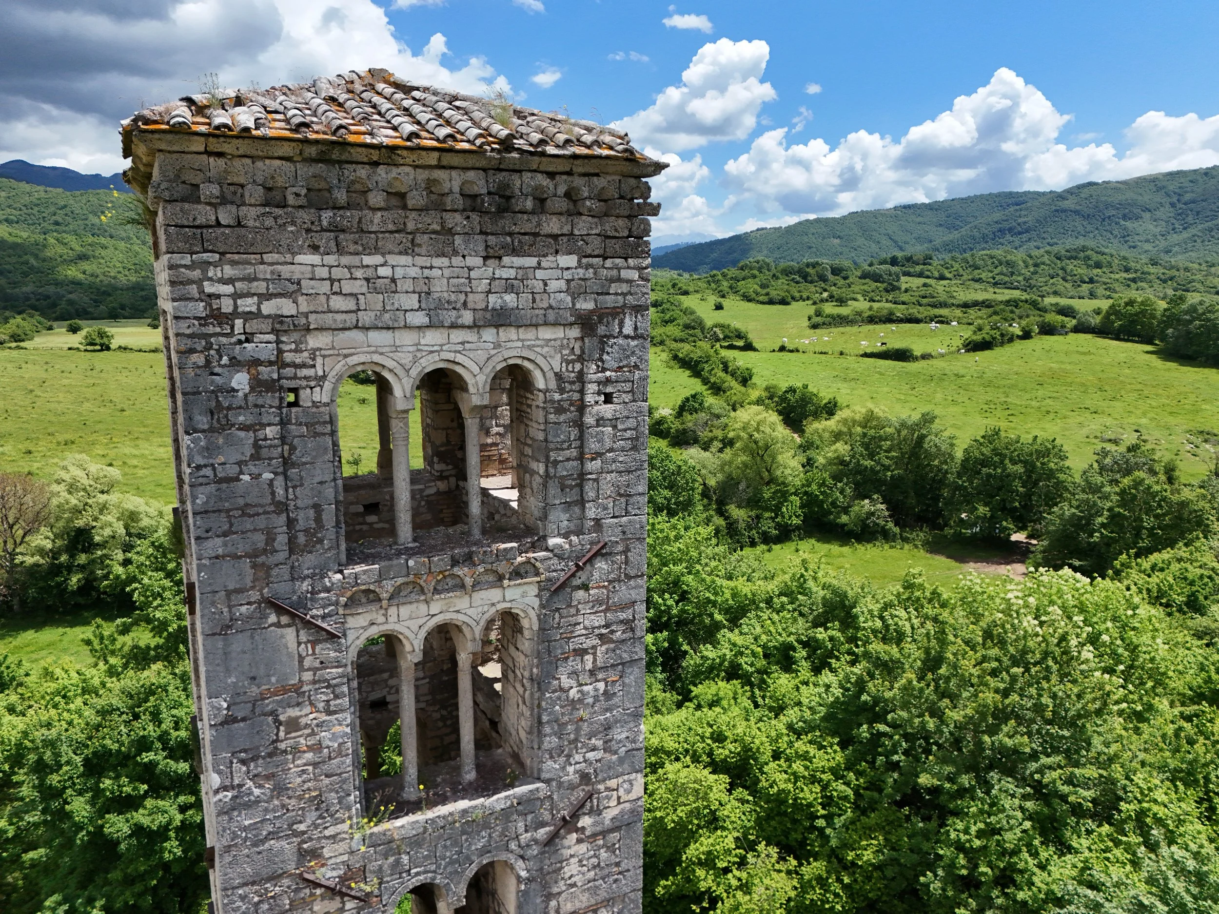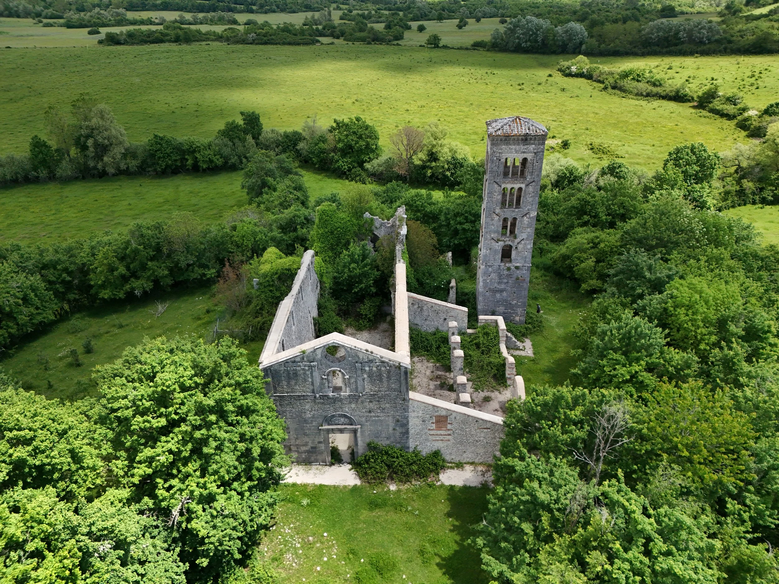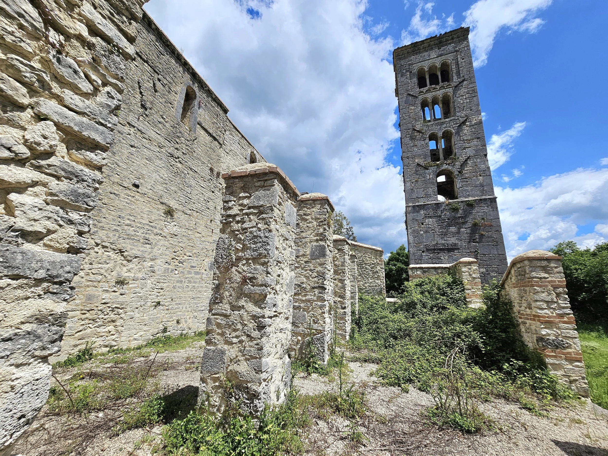 Secondo la tradizione, la costruzione dell'abbazia fu commissionata da Carlo Magno proprio come ringraziamento alla Madonna per la vittoria sui Saraceni appena sopra menzionata. Utilizzata per lungo tempo come monastero dai padri Benedettini (non a caso, un cartello ci ricorda che ci troviamo proprio sul tracciato del "cammino di San Benedetto"), alla fine del medioevo fu abbandonata e piano piano andò in rovina, finendo per perdere molti elementi decorativi a causa di numerosi saccheggi.