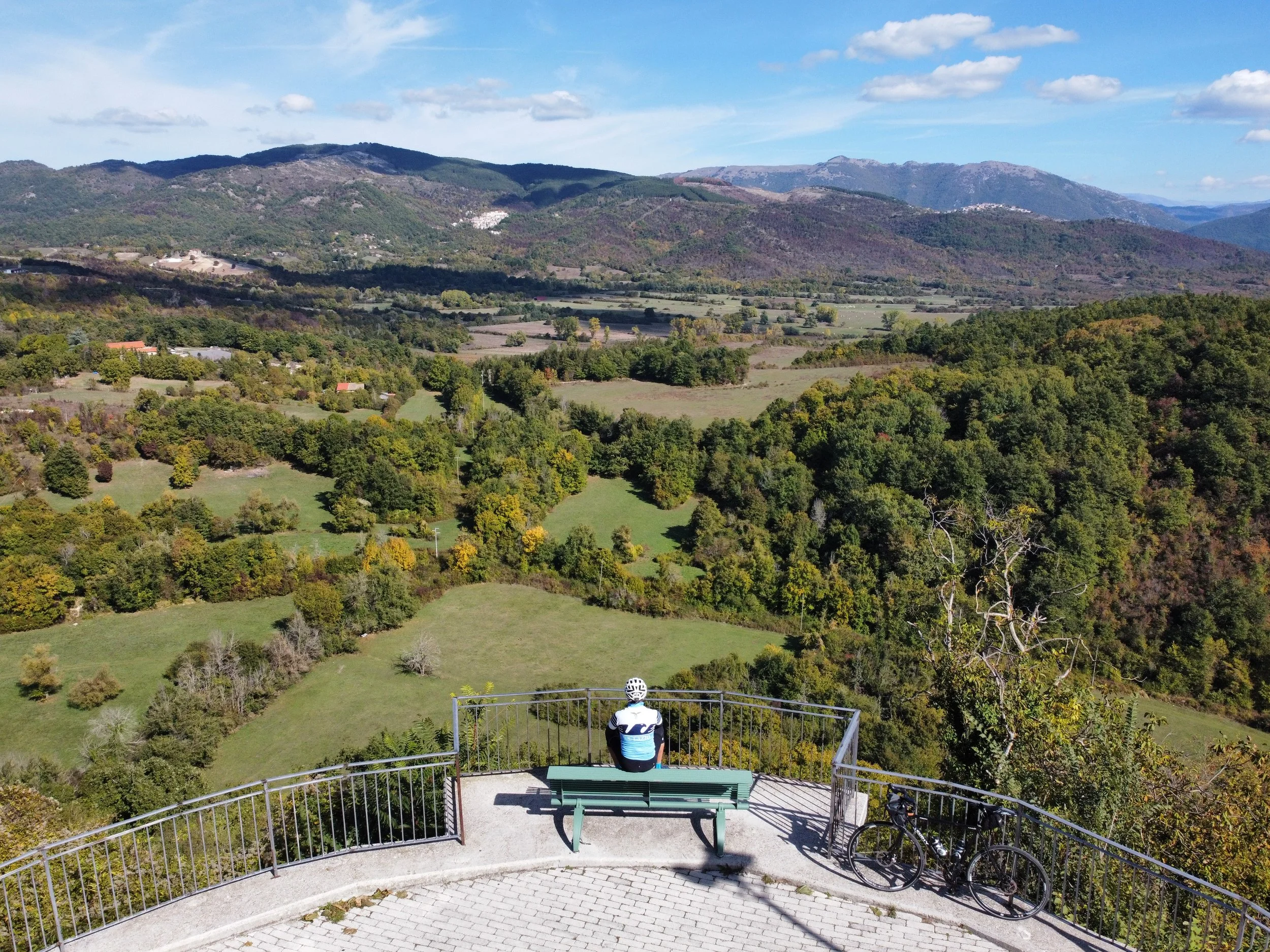 La salita risulta lunga circa 6 km, con una pendenza piuttosto regolare. Anche il fondo compatto non comporta un impegno eccessivo e, così, possiamo goderci il panorama che, via via, si apre sempre di più sulla vallata sottostante, oltre che sui gruppi abruzzesi di Velino e Sirente che possiamo scorgere all'orizzonte.