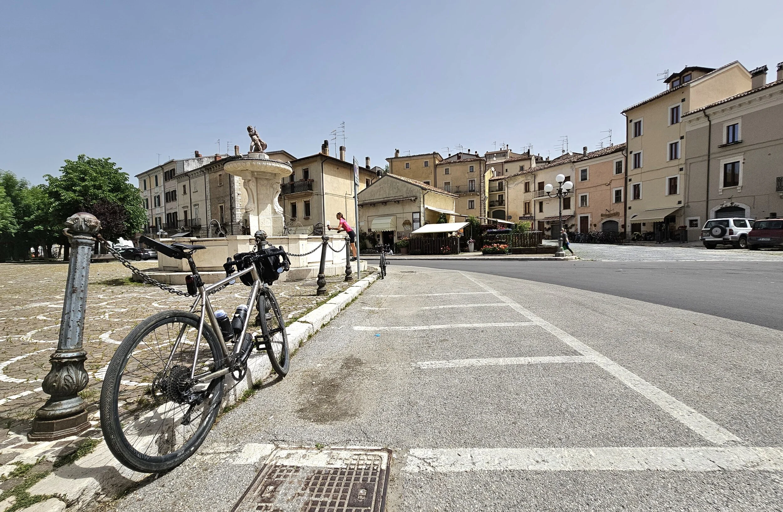 La ciclabile attraversa nuovamente la statale e, dopo pochi chilometri, eccoci nella piazza di Rocca di Mezzo, dove possiamo approfittare per rabboccare le nostre borracce con la freschissima acqua che sgorga dalla grande fontana in pietra.