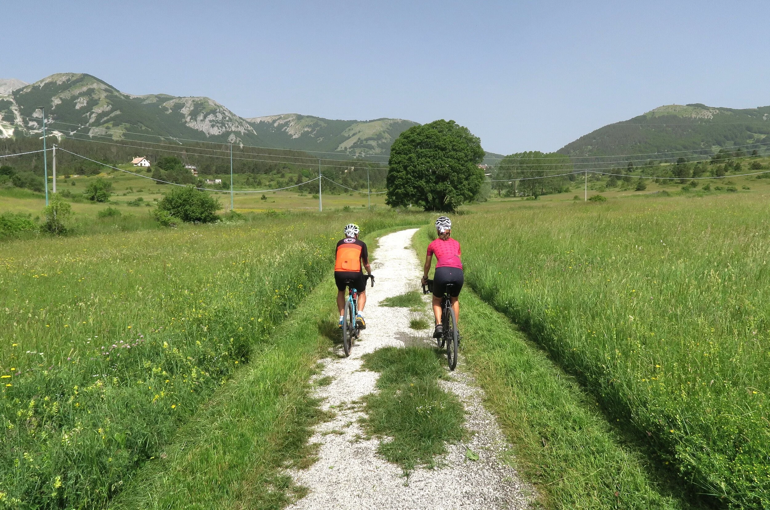 I Piani di Pezza si aprono davanti alle nostre ruote come un maestoso anfiteatro dominato dalle pendici del monte Velino. E' un vero piacere percorrere tutta la strada sterrata che si inoltra nella piana, fino in fondo, dove naturalmente facciamo dietro/front, per godere di un'altra visuale su questo isolato altopiano popolato da mandrie di bovini al pascolo.