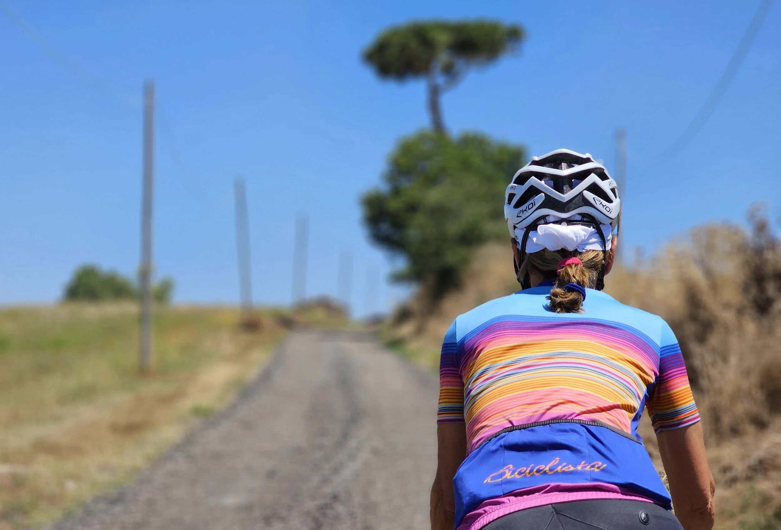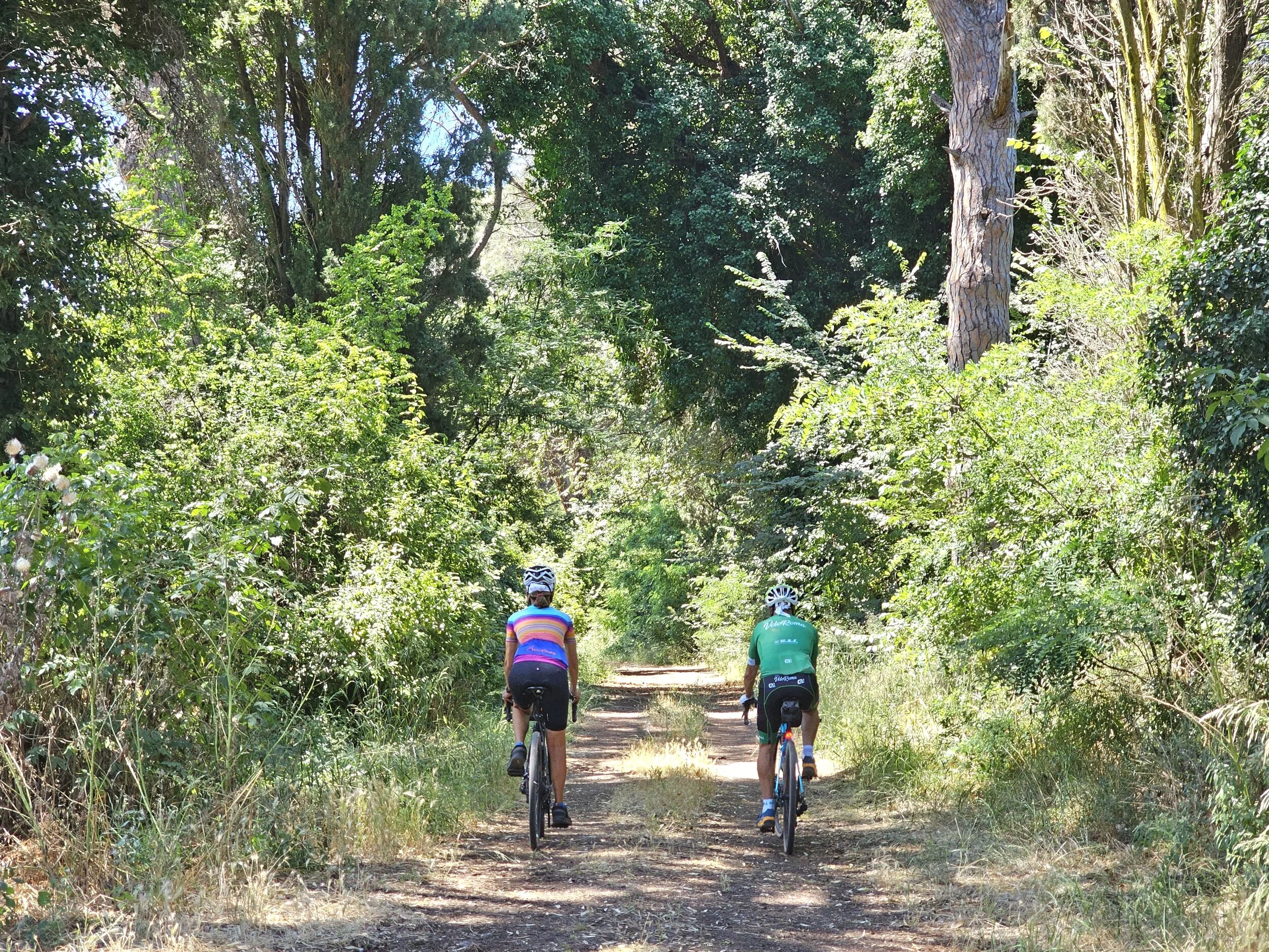 Una secca curva a sinistra ci introduce in un segmento sterrato nel quale occorre fare attenzione per gli improvvisi tratti sabbiosi che si presentano davanti alle ruote. Circondati dalla vegetazione, proseguiamo ai margini degli ampi vigneti che si estendono sulla collina e, attraversate un paio di aziende agricole, ci troviamo a pedalare accanto alla S.S. Aurelia, che oltrepassiamo grazie a un sottopassaggio.