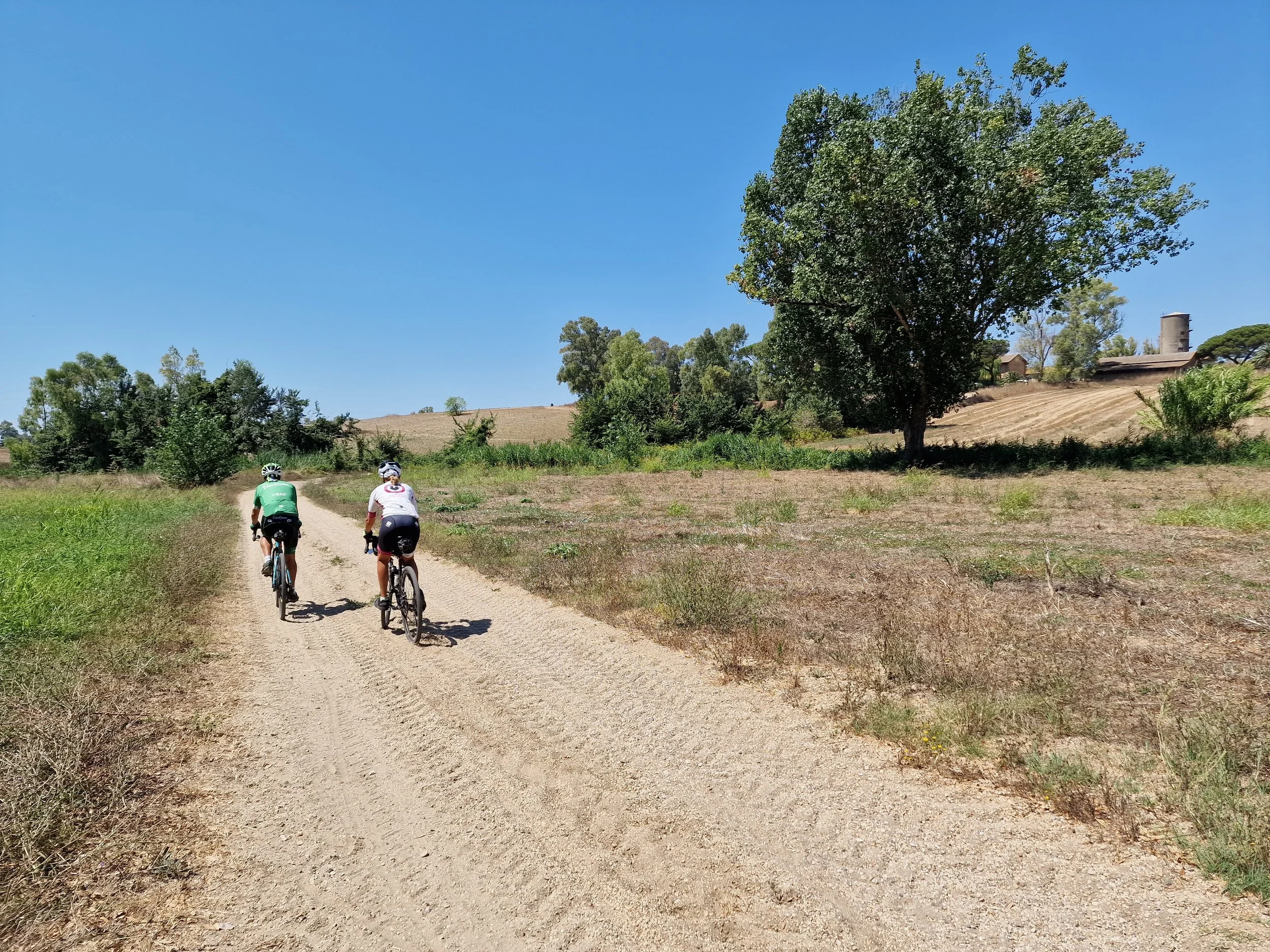 Dalla via di Valle Luterana, che presenta anche l'attraversamento di un suggestivo "canyon" tra pareti di tufo, è infatti sufficiente percorrere un brevissimo tratto della via Settevene-Palo per girare a sinistra, superando una sbarra grazie a un passaggio laterale, per ritrovarci di nuovo con le ruote sullo sterrato. Procediamo attraverso i campi per più di 4 km, facendo attenzione ad alcuni tratti sabbiosi, fino a ritrovarci di nuovo alle porte di Cerveteri.