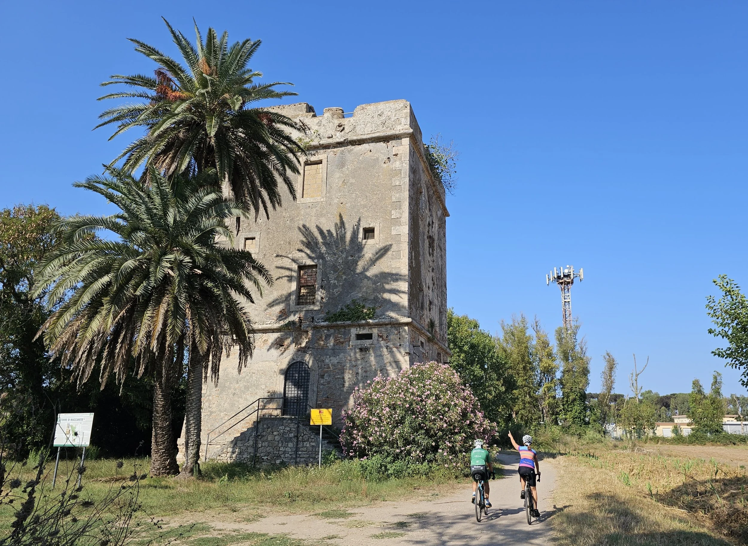 Oltrepassato il borgo di Maccarese, al ponticello giriamo a destra e, poco dopo, ci inoltriamo su via Tirrenia, una strada isolata e lontana dal traffico che più avanti diviene sterrata. Improvvisamente, come se la vegetazione si aprisse a mo' di sipario, un'altra sorpresa ci appare davanti agli occhi. L'imponente Torre di Maccarese, detta anche Torre Primavera, fu fatta erigere da Papa Pio V nell'anno 1575, a difesa della costa come avamposto del castello San Giorgio che tra qualche km potremo ammirare da vicino.