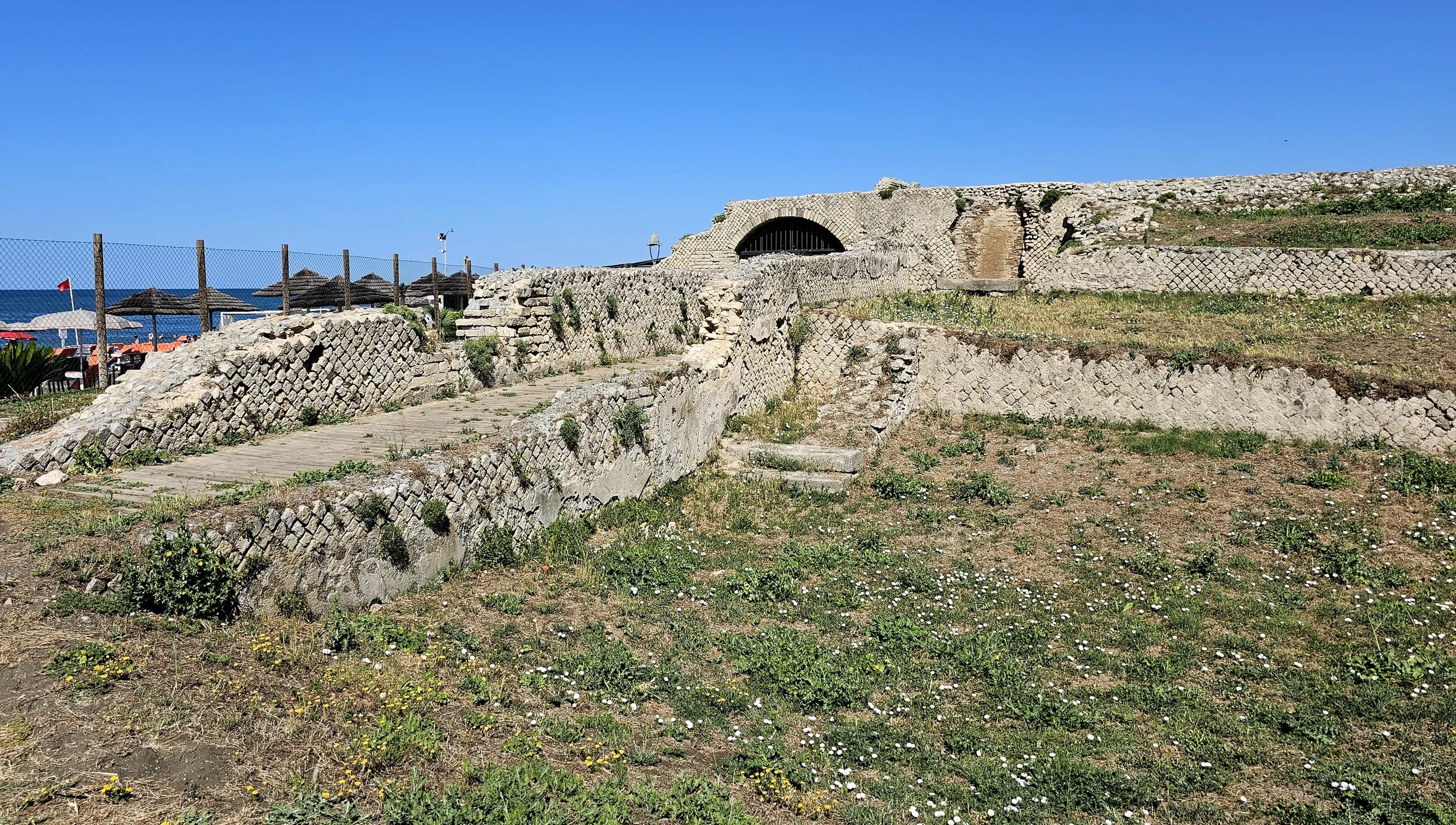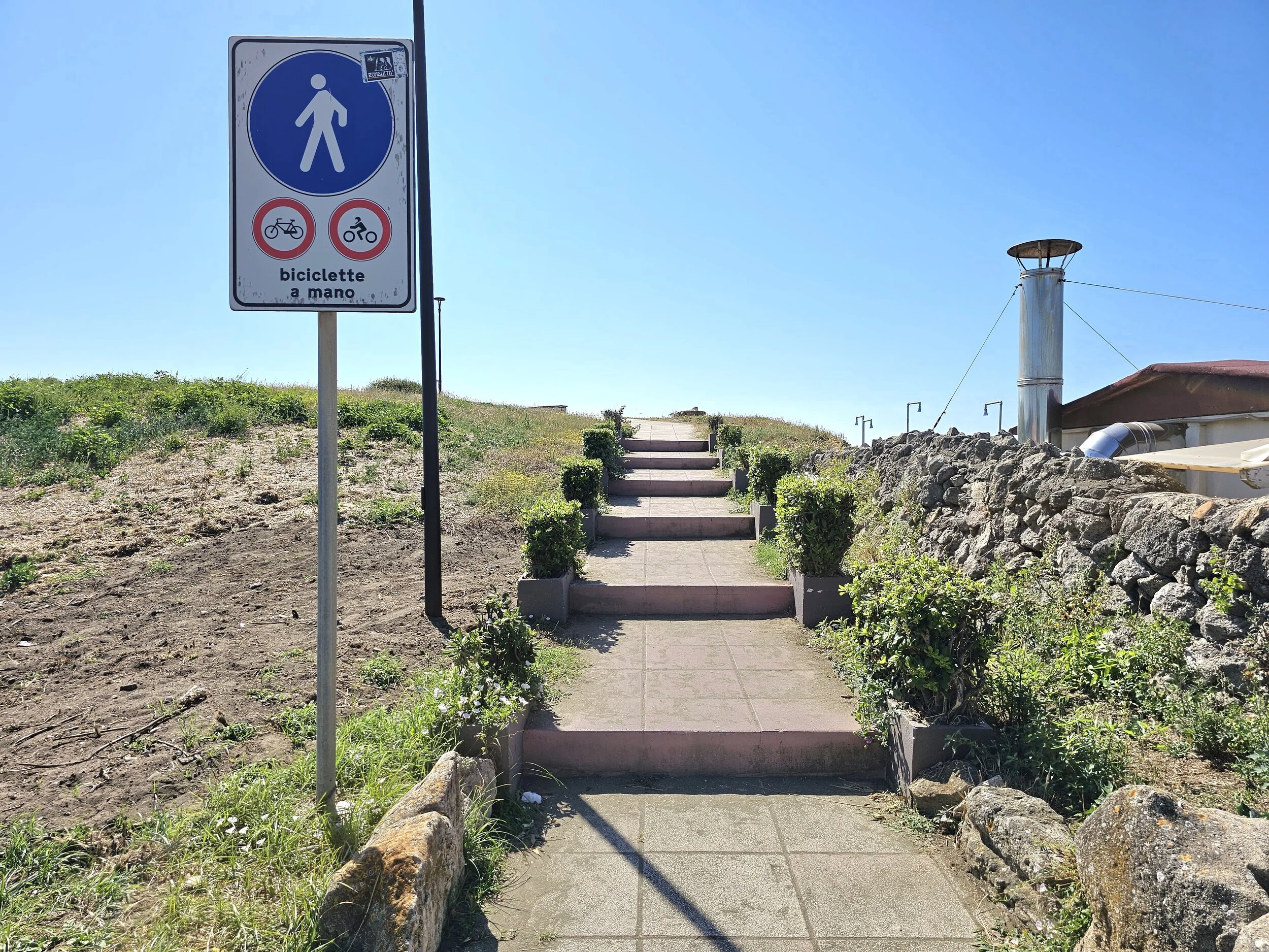 Ma questa amena località nasconde altre sorprese. Tornati indietro e raggiunto nuovamente il lungomare al km 78,4 dell'itinerario, proseguiamo fino a trovare dei gradini sui quali ci arrampichiamo con bici condotta a mano, fino a raggiungere la sommità della collina.