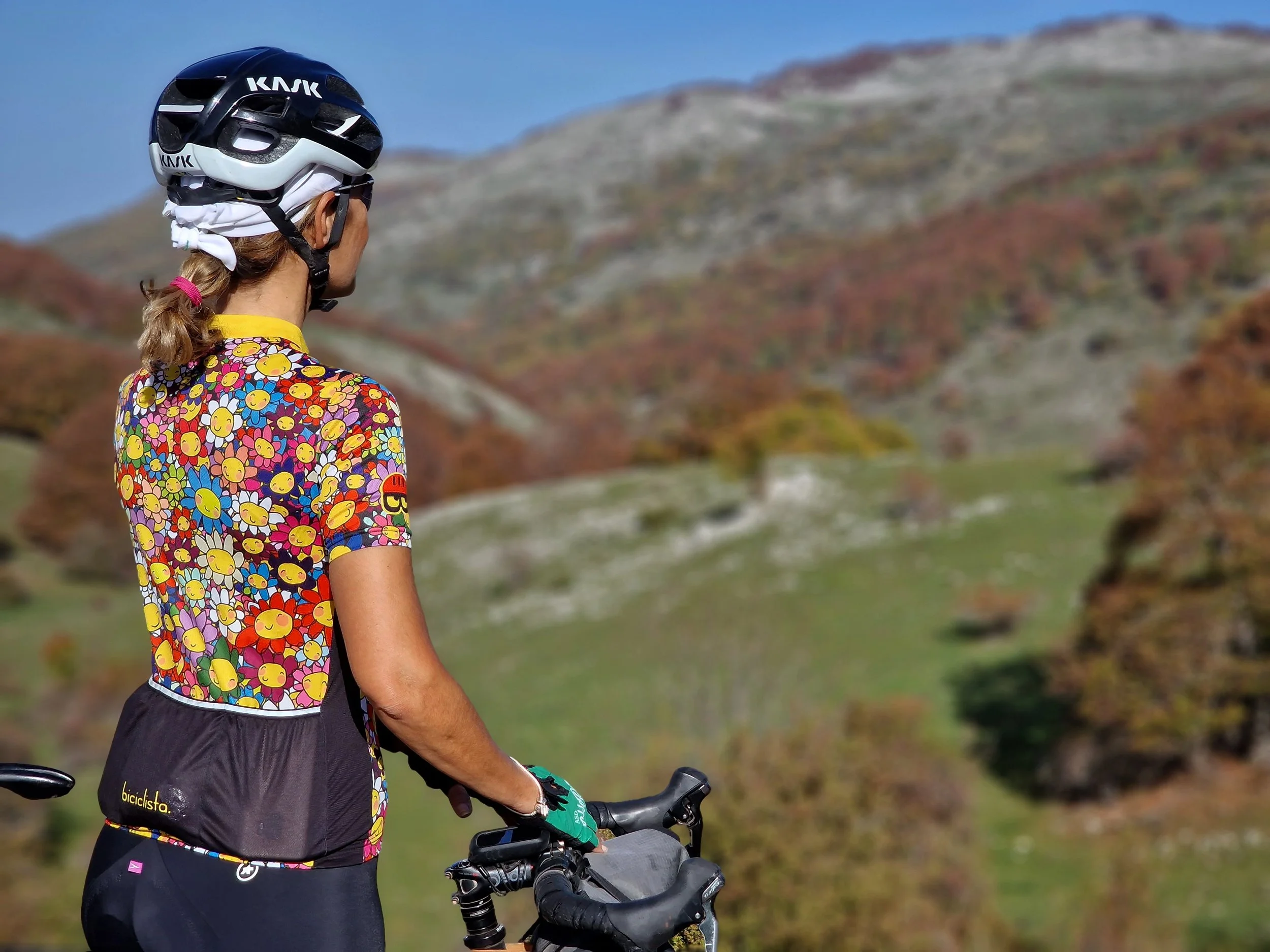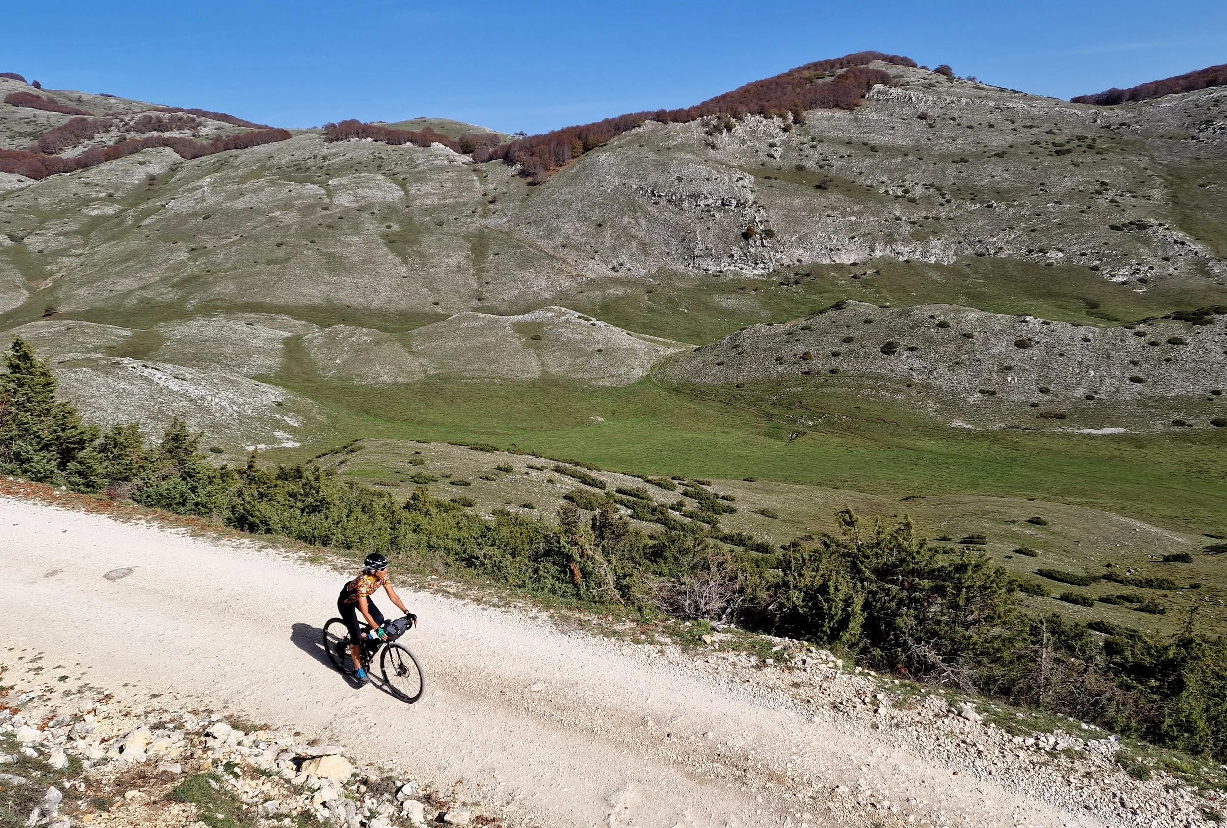 Lasciata l'auto e inforcate le bici, affrontiamo immediatamente la lunga salita che ci porterà nel cuore delle montagne. Dopo appena 2 chilometri, la strada asfaltata cede il posto a una larga strada bianca dal fondo piuttosto compatto e agevole da affrontare.