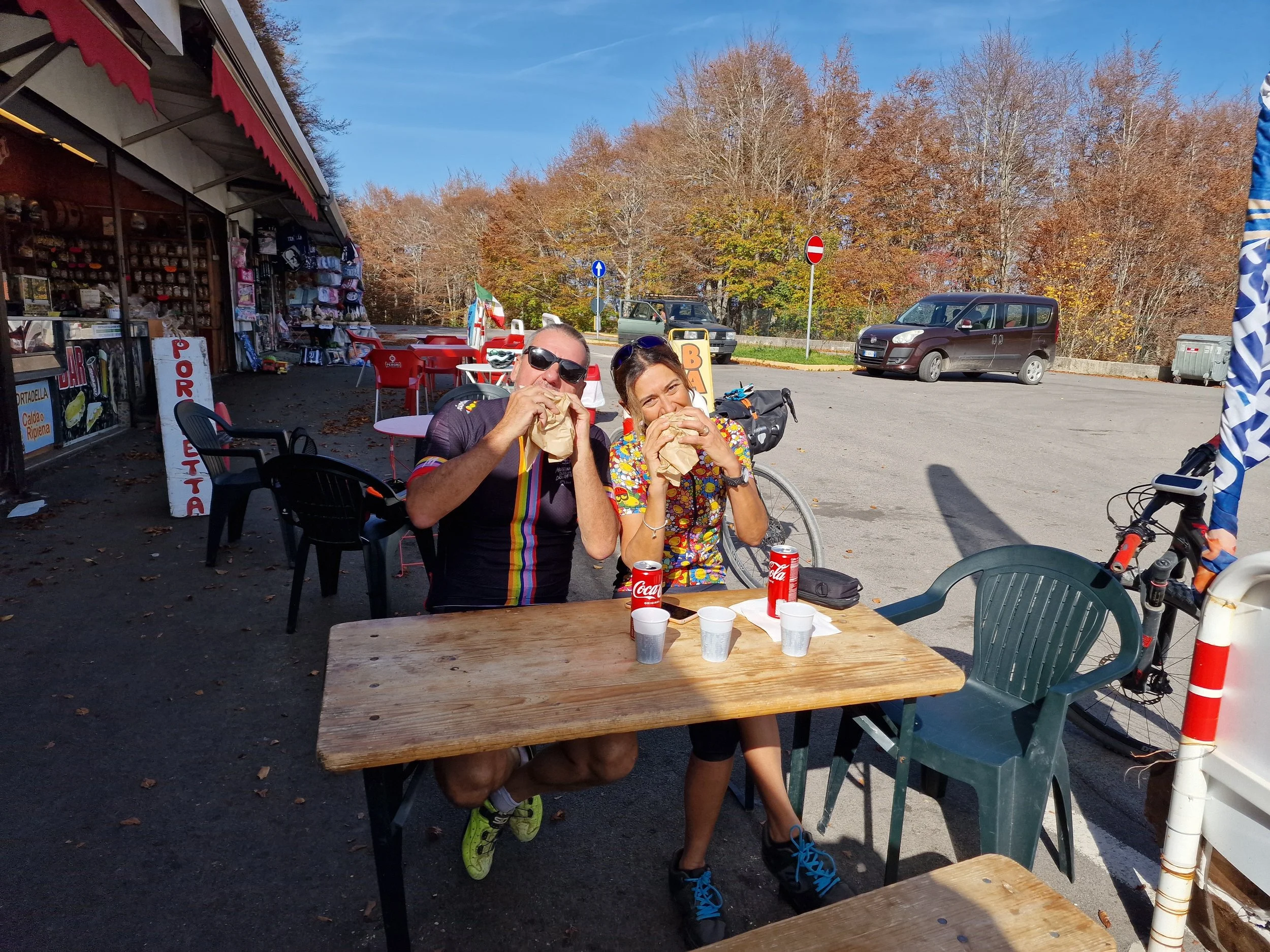 Appena il tempo di rifiatare tra le mandrie di bovini che pascolano sul pianoro ed ecco che inizia la seconda parte della salita verso il valico di Monte Morbano. Il fondo, per fortuna, ora si presenta più compatto e pedalabile, ma la pendenza per circa 1,5 km non molla davvero mai… Il panorama che, allo scollinamento, si apre alla nostra sinistra ripaga in ogni caso di tutta la fatica accumulata!