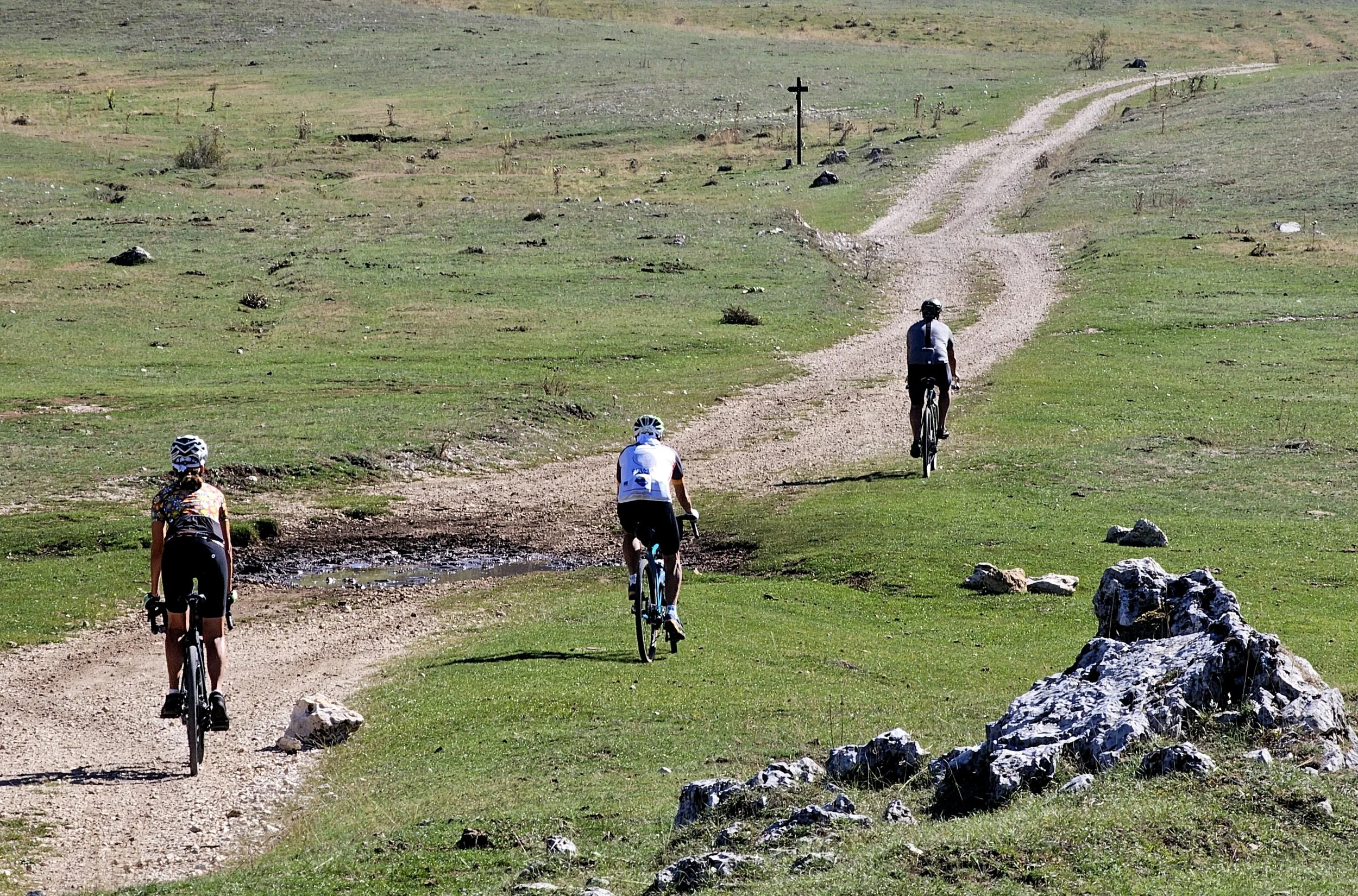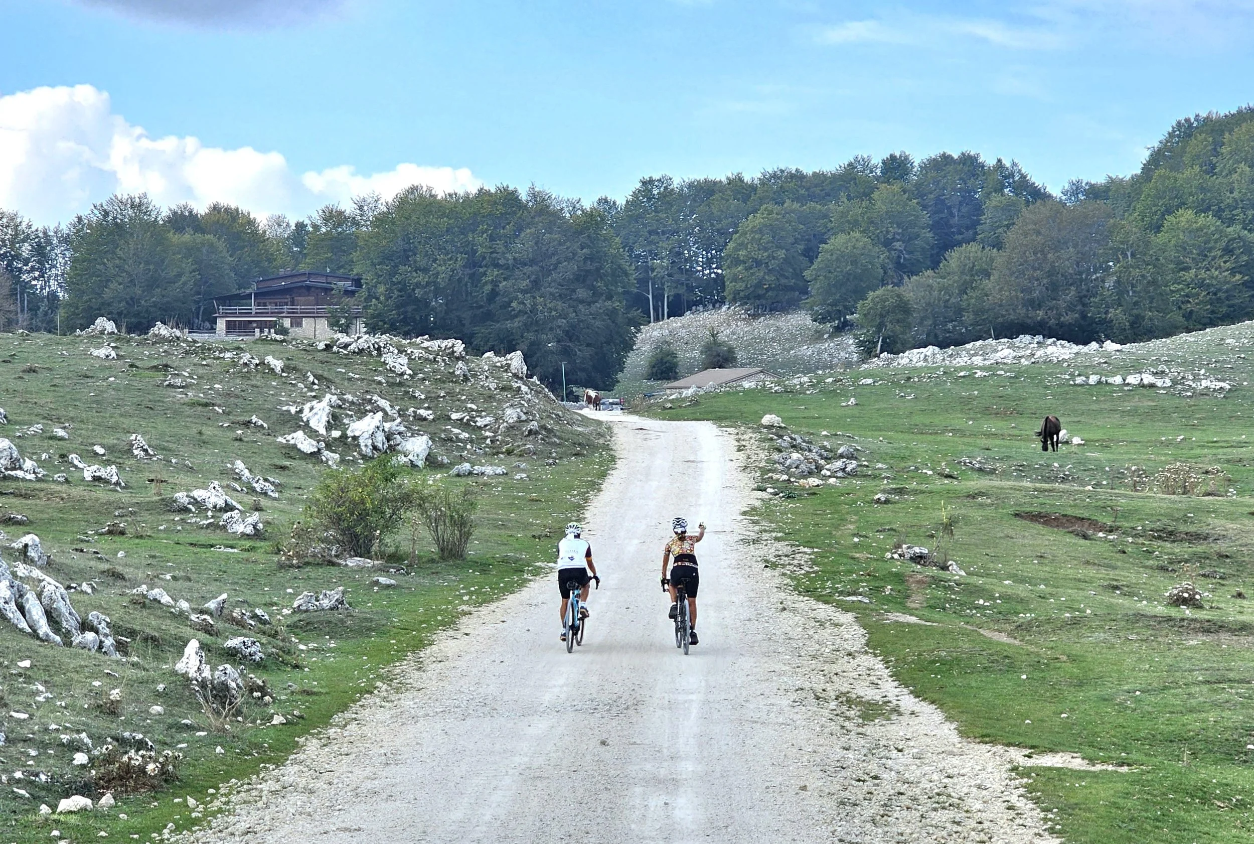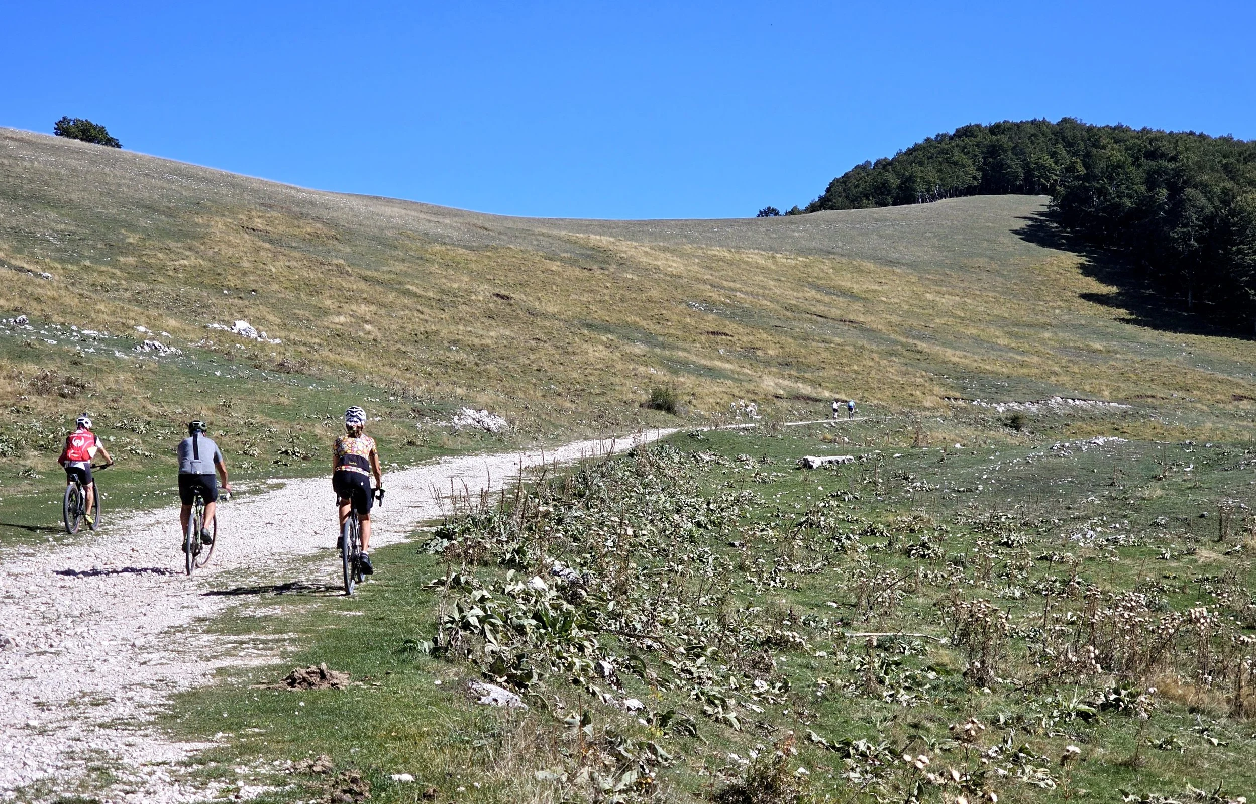 Al km 2,2 dalla partenza, ecco la prima salita. Breve (appena un chilometro e mezzo) ma piuttosto impegnativa, anche in considerazione del fondo caratterizzato da ampie zone di pietrisco che possiamo ritrovare in tutte le zone carsiche dell’Appennino.