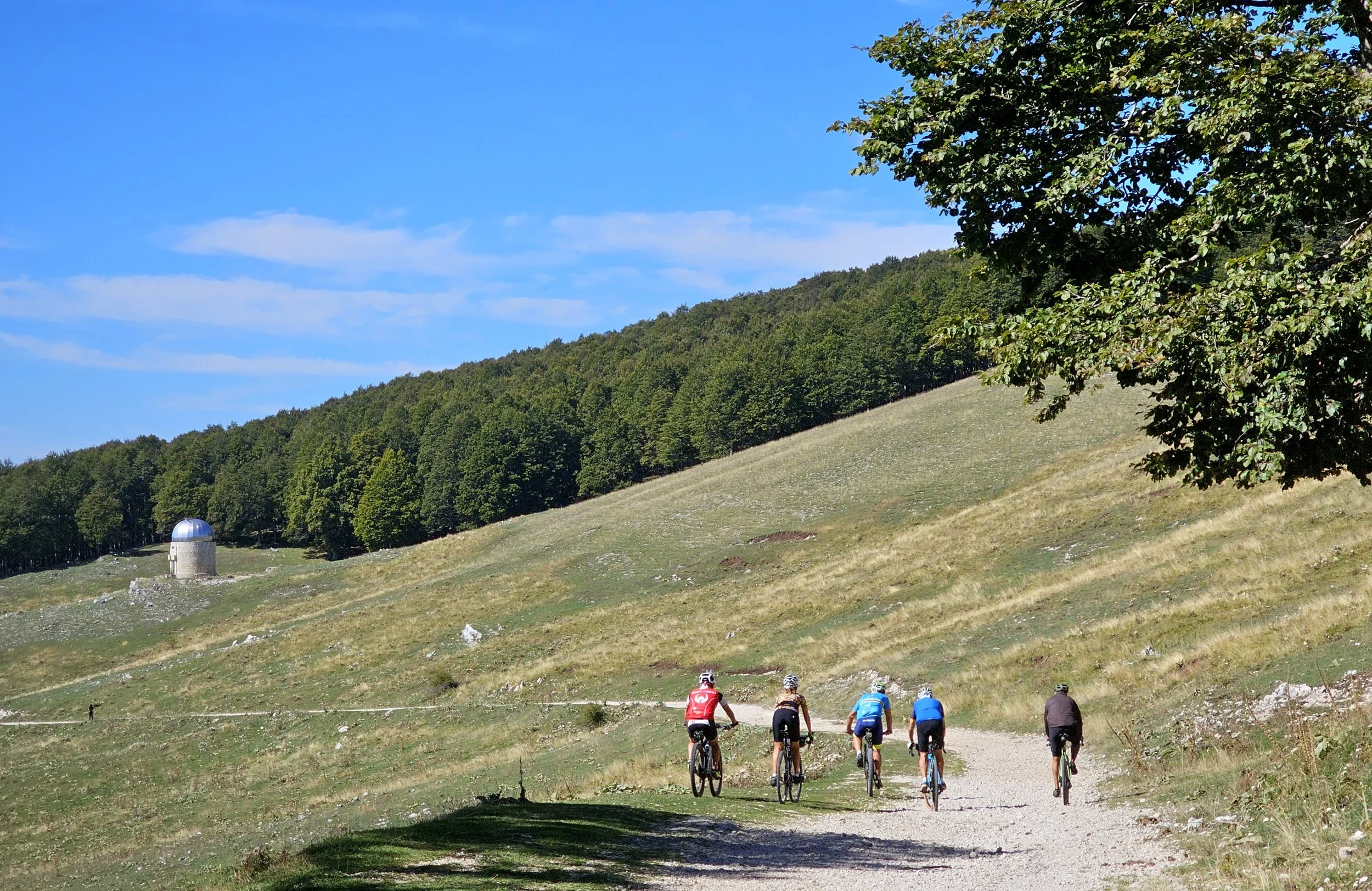 Il panorama, ora, si apre davanti a noi. Pedaliamo attraversando un ampio altopiano, denominato Campominio, su cui spicca un osservatorio astronomico ben noto a tutti gli escursionisti della zona.