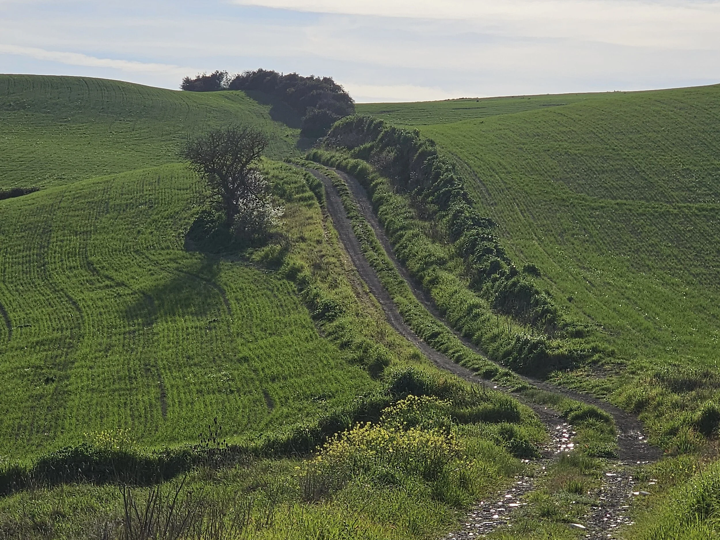 Ritornati sui nostri passi (o, meglio, sulle nostre ruote…), usciamo dal paese e prendiamo una stretta strada che ci proietta immediatamente in aperta campagna. Superata la chiesetta della Madonna dell'Olivio, rieccoci su un tratto sterrato che si presenta via via sempre più impegnativo, sia per la pendenza sia per le tracce lasciate dai trattori che rendono il terreno ancora più sconnesso.