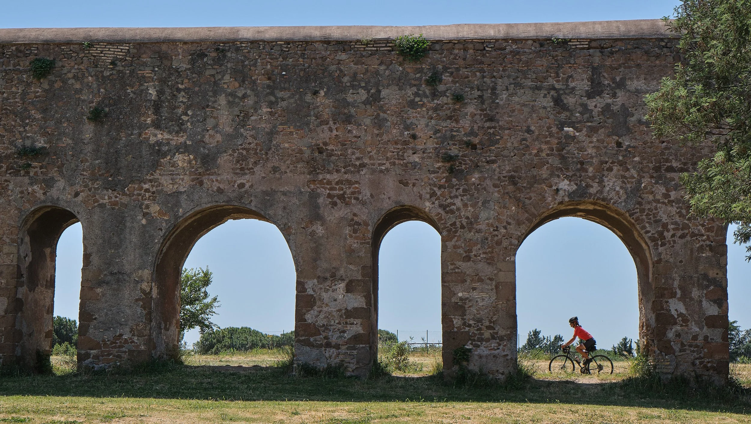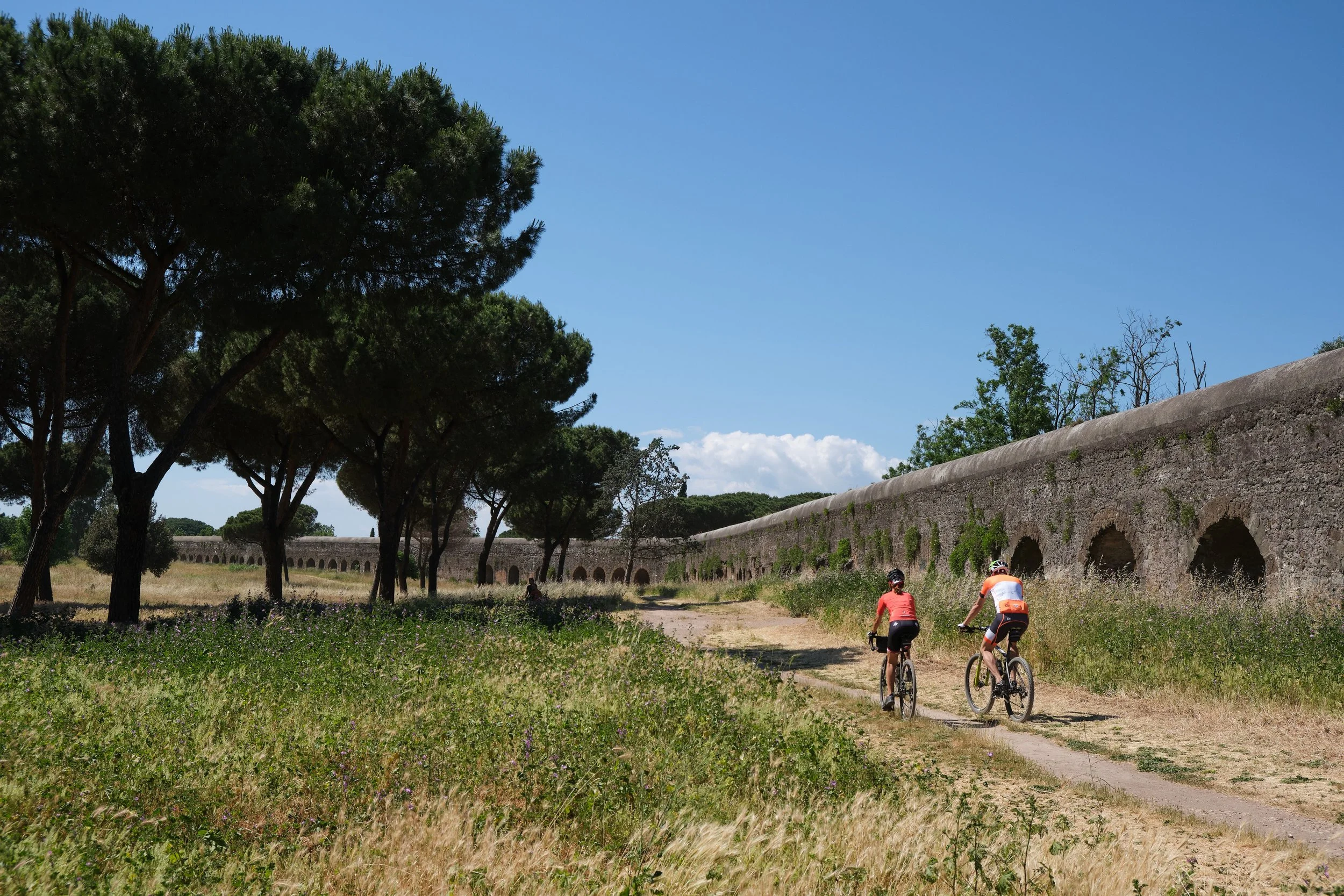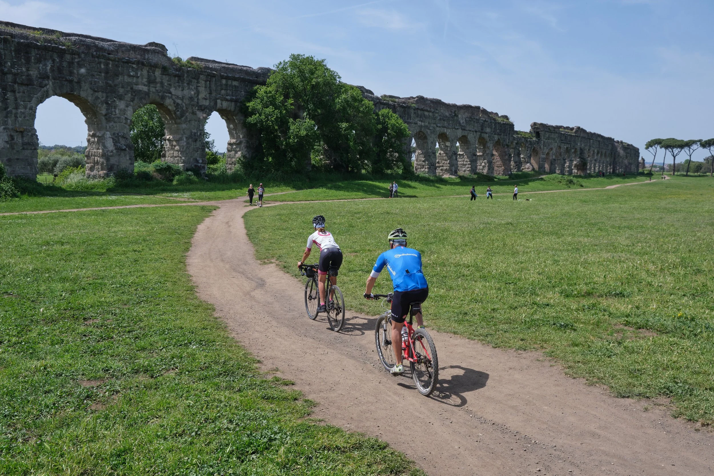 Abbiamo da poco superato la metà del percorso e, in effetti, ci troviamo ora a girovagare piacevolmente e liberamente sui sentieri sterrati di quello che è denominato il Parco degli Acquedotti. Il panorama, improvvisamente, si spalanca davanti alle nostre ruote e i Castelli Romani, sullo sfondo, fanno da quinta al tipico paesaggio dell'agro romano.