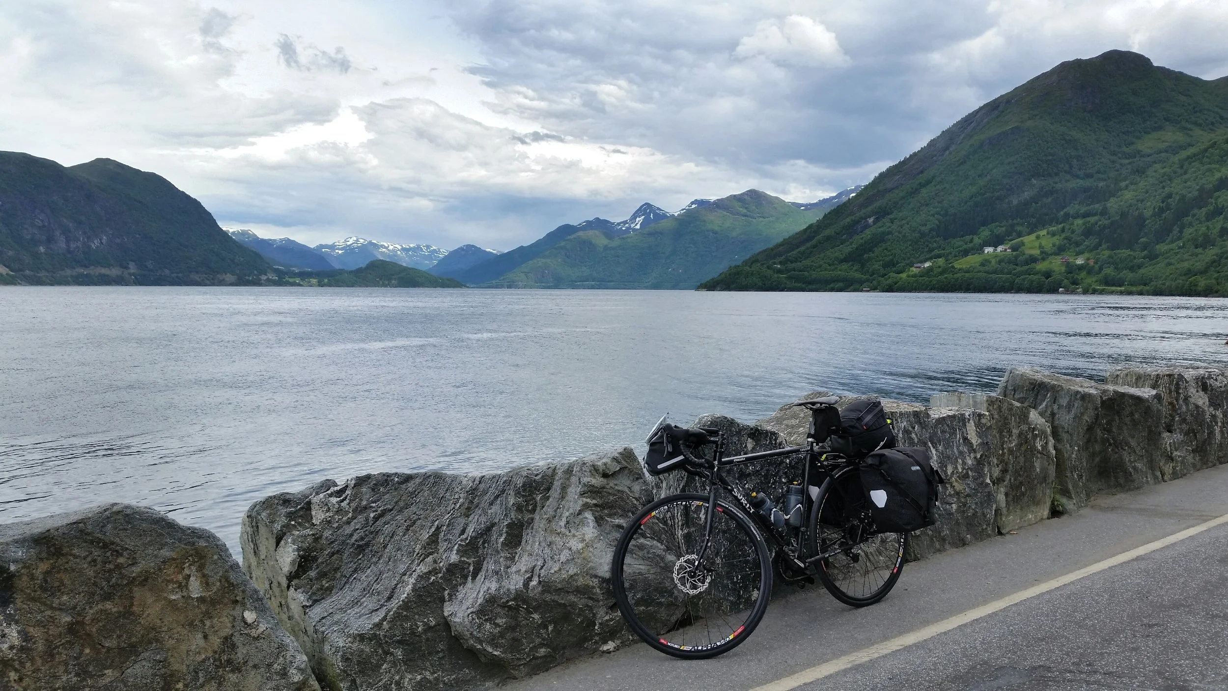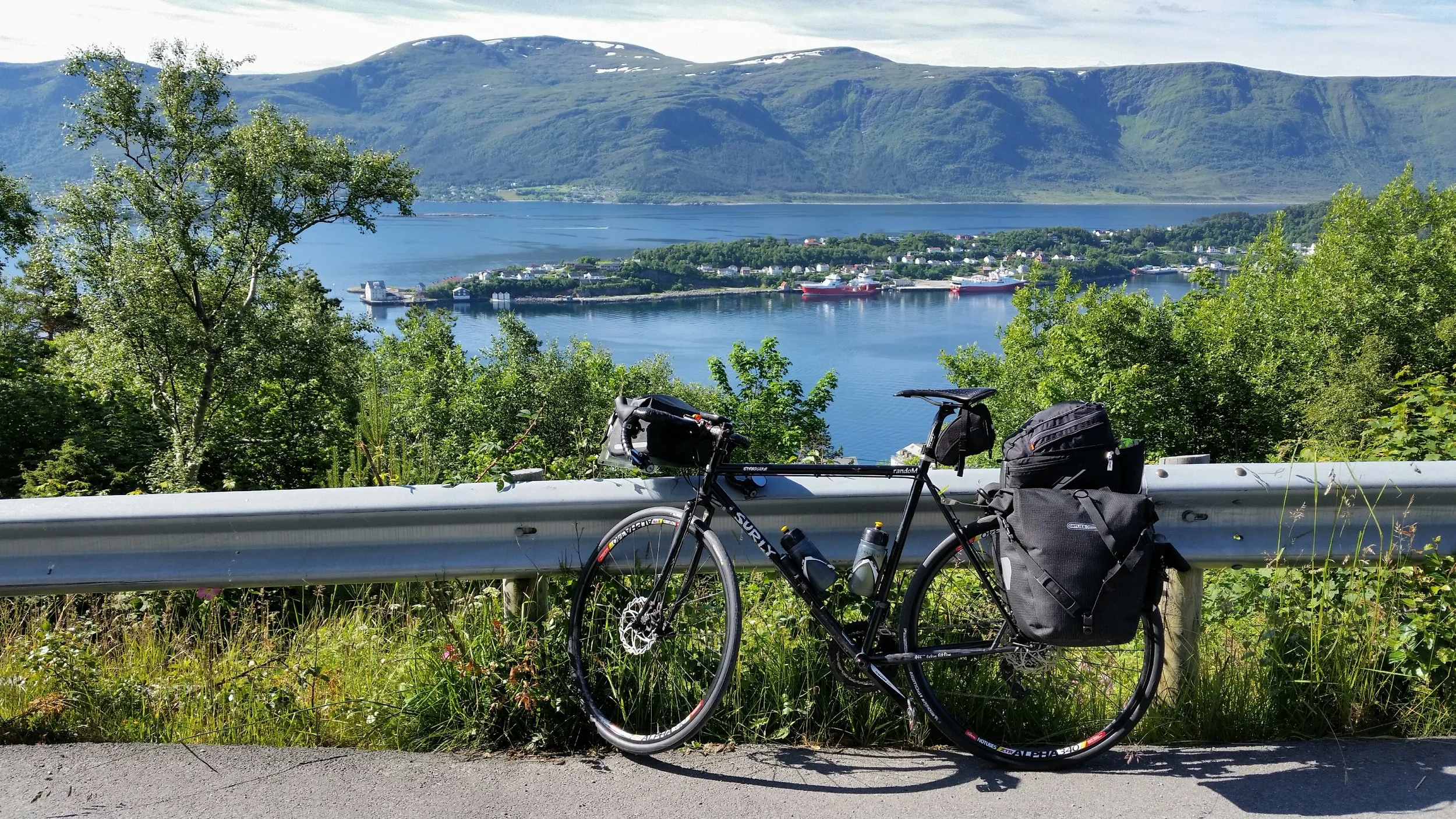 Si tratta di una bici da corsa tutta in acciaio (anche la forcella); economica, comoda, pesante e robusta, equipaggiata con freni a disco (meccanici) e predisposta per alloggiare copertoni larghi da sterrato (anche se, per questo viaggio, ho optato per più scorrevoli preumatici stradali da 28 mm.) e portapacchi (su cui ho montato una coppia di borse Ortlieb a tenuta stagna, nere ma con una miriade di puntini catarifrangenti che le rendono ad alta visibilità quando sono colpite dai fari dei veicoli a motore).