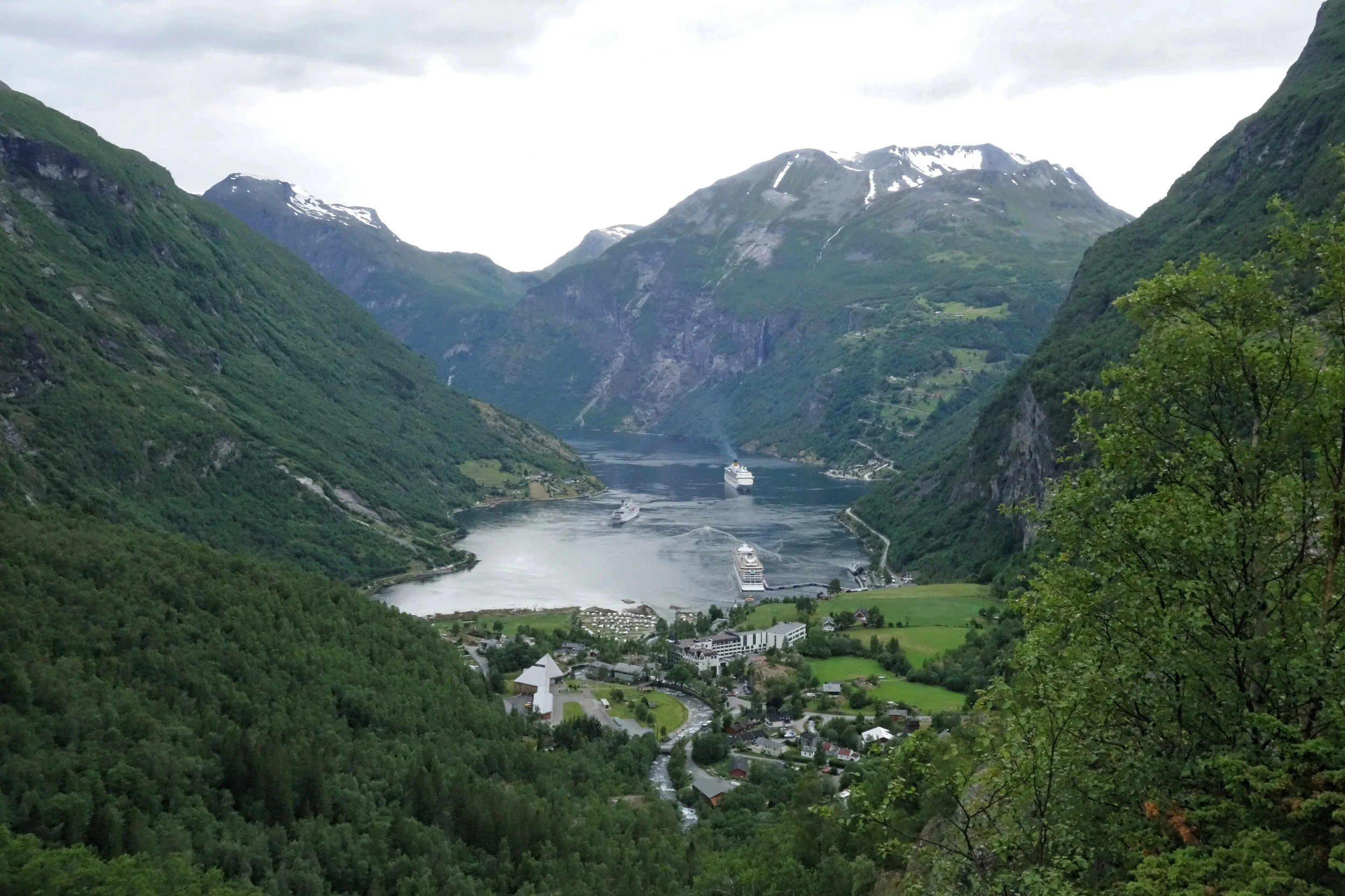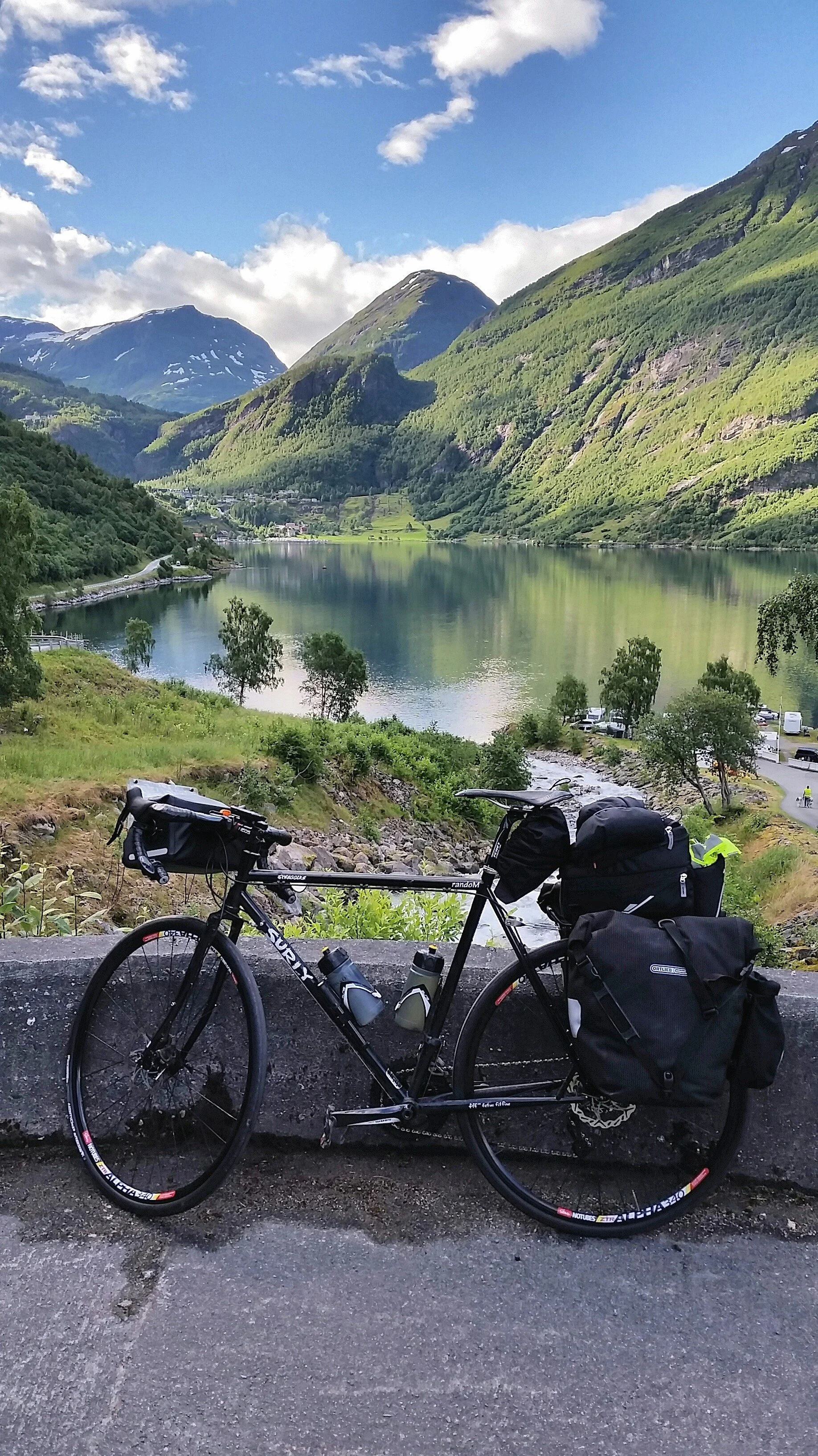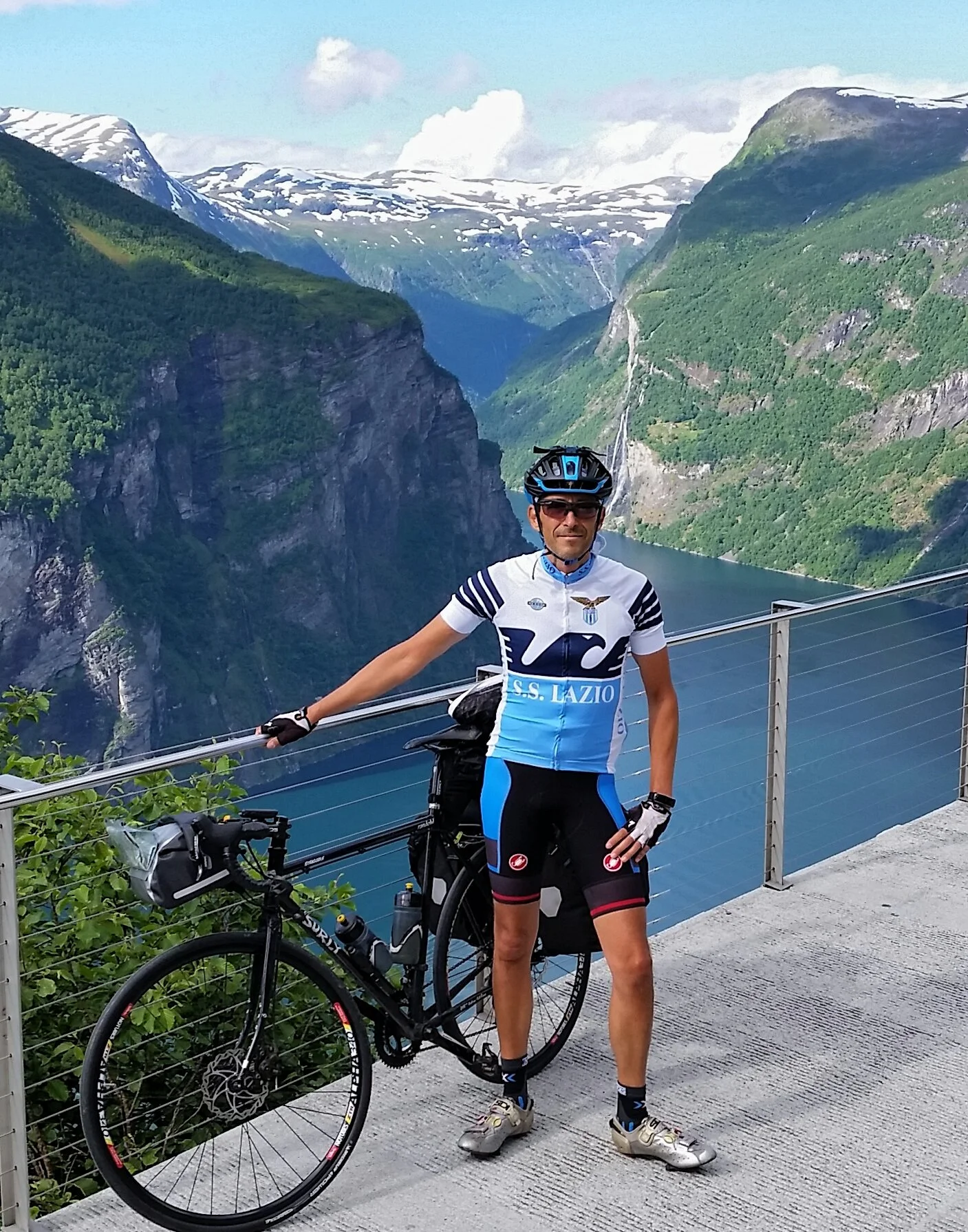 Naturalmente, in bici ho scelto questa seconda opzione, seppure davvero faticosa (la salita è lunga 6 km. con un dislivello di 600 metri, praticamente una pendenza media del 10%, che affrontata con la bici carica di bagagli non risulta proprio una passeggiata...). L'arrivo al belvedere ripaga di ogni fatica: la vista spazia dal paese di Geiranger, in fondo al fiordo, fino alla cascata delle "sette sorelle", dall'altra parte, verso lo Stortfjorden. La denominazione di "strada delle aquile" è stata anche la piacevole occasione per una... divagazione dal tema: l'omaggio alla squadra di calcio del cuore con una maglia da bici portata nelle borse appositamente per questa giornata.
