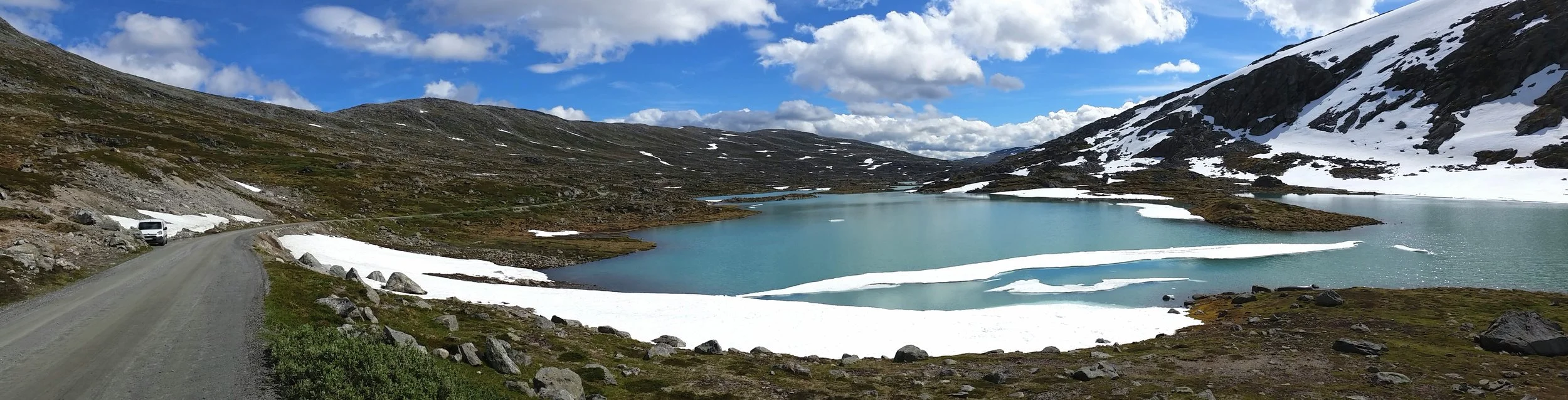 E' ciò che ho potuto sperimentare lungo la Strynefjellsvegen, il bellissimo e lungo altopiano che ho percorso a una quota di quasi 1.200 metri s.l.m. pedalando su una strada dal fondo sterrato ma compatto, in un ambiente pressoché privo di mezzi a motore, in quanto questi ultimi preferiscono la più moderna e scorrevole "alternativa" costituita da una sequela di gallerie (comunque interdette alle bici).
